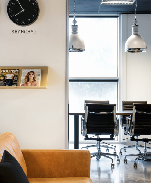 Stylish elements add sophistication. Pendant fixtures build depth, pairing seamlessly alongside task and natural lighting. Upon entry is a recessed display shelf embedded into the concrete wall, filled with fashionable footwear. A statement piece that expresses the space’s inspiration and use. Clocks displaying the time in three of the world’s fashion capitals, London, New York and Shanghai, make for a relevant design focus straying from traditional artwork. The most unique inclusion is an ideas mobile that hangs from the ceiling, imitating a chandelier this element adds character and interest.